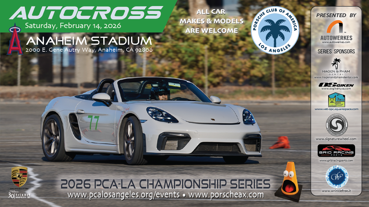 PCA Los Angeles invites you to come out and join us for the 3rd event in our monthly autocross series. Our series has been organized by volunteers with a long history of running POC and PCA sanctioned autocross events. Autocross is a fun way to learn the basic handling dynamics of your car in a controlled environment.