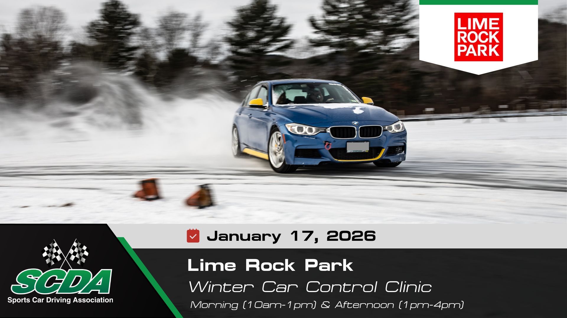 The SCDA WINTER Car Control Clinic is designed to have you drive your own car or SUV at Lime Rock's Full 3/4 mile long Infield Track plus new available configurations!